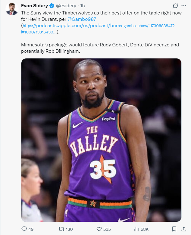 北京时间6月18日,《福布斯》记者埃文-斯迪瑞继续跟踪报道关于凯文-杜兰特交易的细节,他透露明尼苏达森林狼依旧在努力与太阳管理层交涉,他们愿意送出最高的报价为鲁迪-戈贝尔、唐特-迪温琴佐、罗布-迪林厄姆。