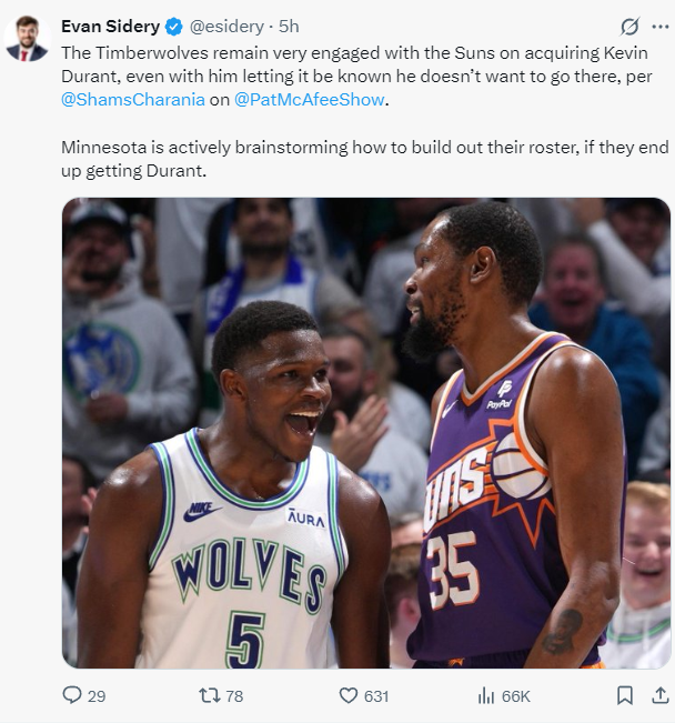 根据Shams与Pat的说法,杜兰特本人是不愿意去明尼苏达打球的,但太阳管理层还是在与森林狼积极的沟通,因为太阳管理层只想要利益最大化,如果森林狼最终交易得到杜兰特,球队会重新评估打造一支冲冠阵容。
