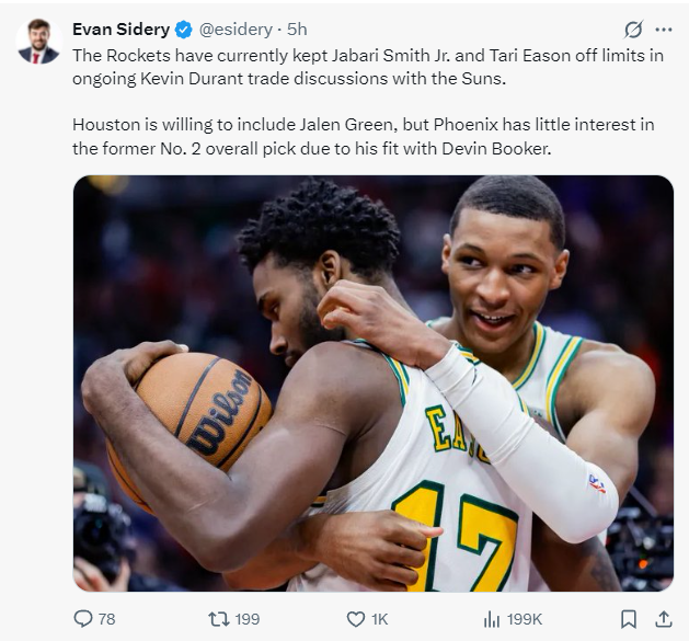 休斯顿火箭队的报价在一天之前就已经透露过(杰伦-格林+2025年10号签),火箭这边没有提高报价,太阳想要索取小贾巴里-史密斯与塔里-伊森被拒绝,太阳队认为杰伦-格林跟太阳阵容适配性过低还需要找寻其他球队接手所以交易也未成行。