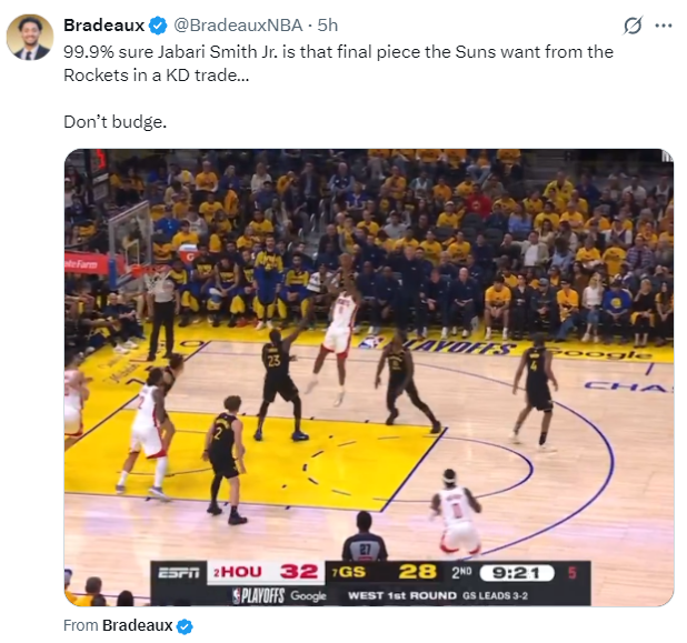 休媒回应:99.9%的人都不会为了交易杜兰特而送出小贾巴里-史密斯。